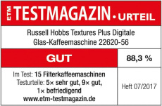 Die Benutzerfreundlichkeit der Kaffeemaschine von Russell Hobbs ist bemerkenswert. Das moderne Design passt gut in jede Küche, und die Bedienelemente sind intuitiv angeordnet. Die Glaskanne ist bruchsicher und hat eine optimale Größe, um mehrere Tassen frisch gebrühten Kaffees zu servieren.